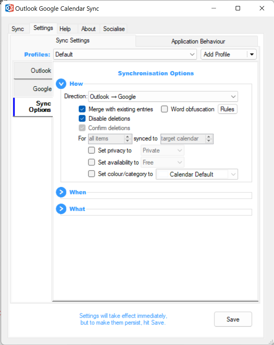 Steg 3: Spara inställningarna och växla tillbaka till fliken Synkronisera. Klicka på Starta synkronisering för att slå samman mötena från de Outlook- och Google-kalendrar du valt: