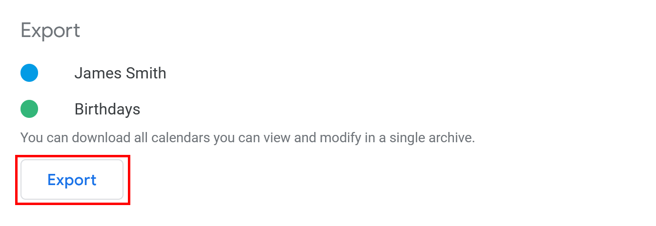 Välj Importera och exportera i navigeringsmenyn till vänster. Klicka sedan på Exportera i avsnittet Exportera. Google skapar automatiskt en ZIP-fil med din mötesinformation i iCal-format.