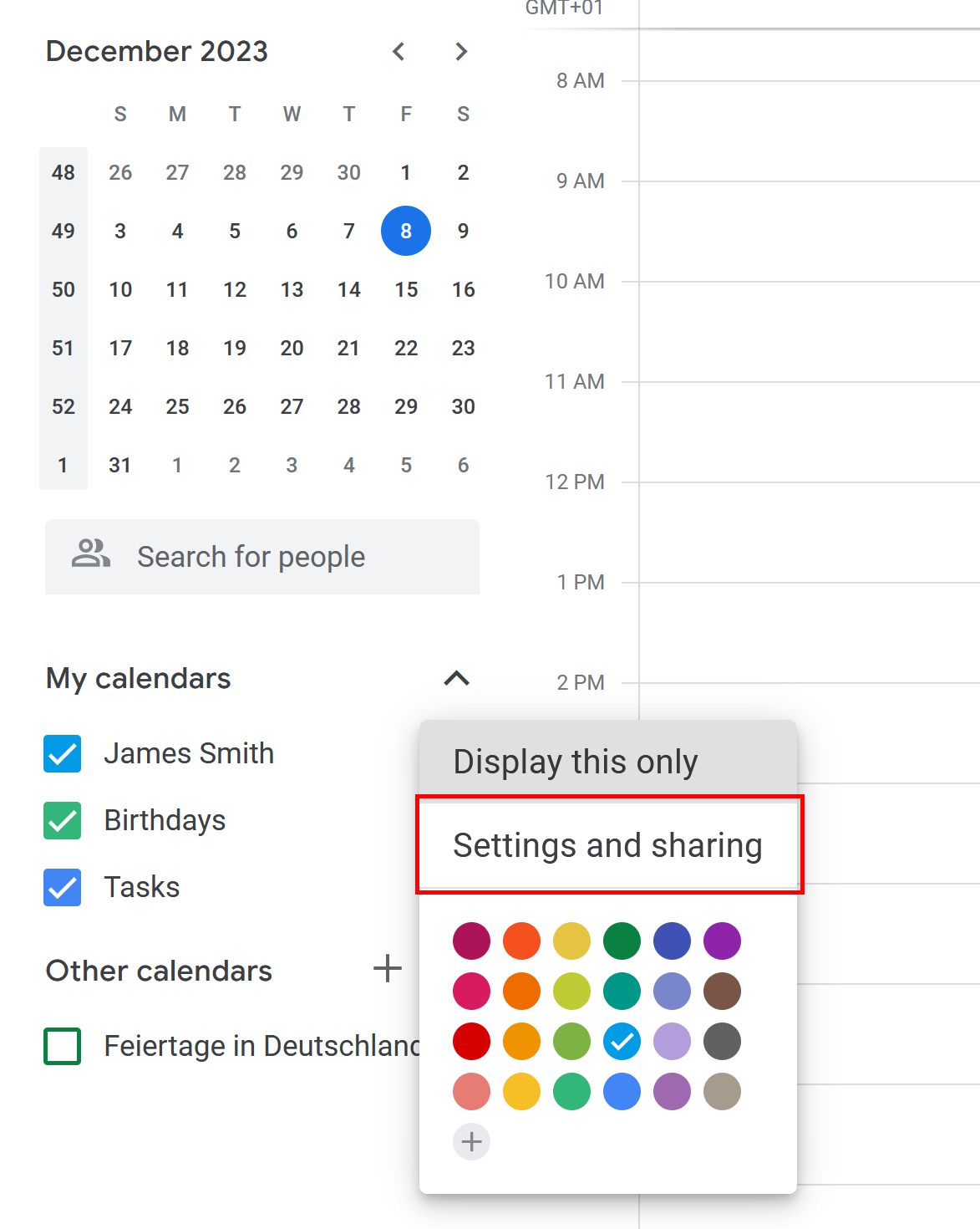 - Öppna inställningsmenyn för den kalender du vill prenumerera på i vänster sidfält genom att klicka på de tre punkterna bredvid kalenderens namn. Välj sedan Inställningar och delning.