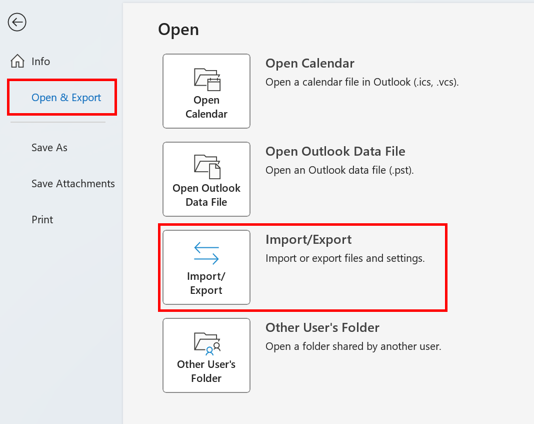 För att importera din Google Kalender med hjälp av Outlook-datorprogrammet, börja med att öppna klienten. Leta reda på fliken Fil och välj Öppna och exportera. Klicka på Importera/exportera för att öppna guiden Importera och exportera.