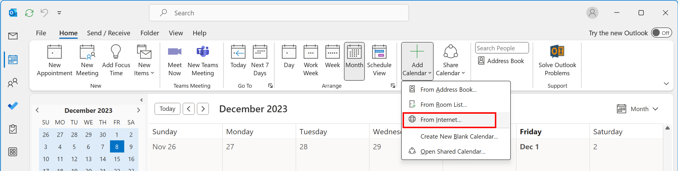 - Ändra vyn i Outlook till kalendervyn och klicka på Start > Lägg till kalender > Från Internet.