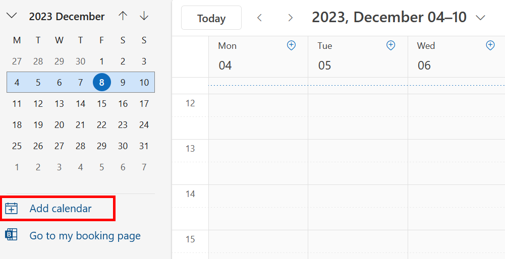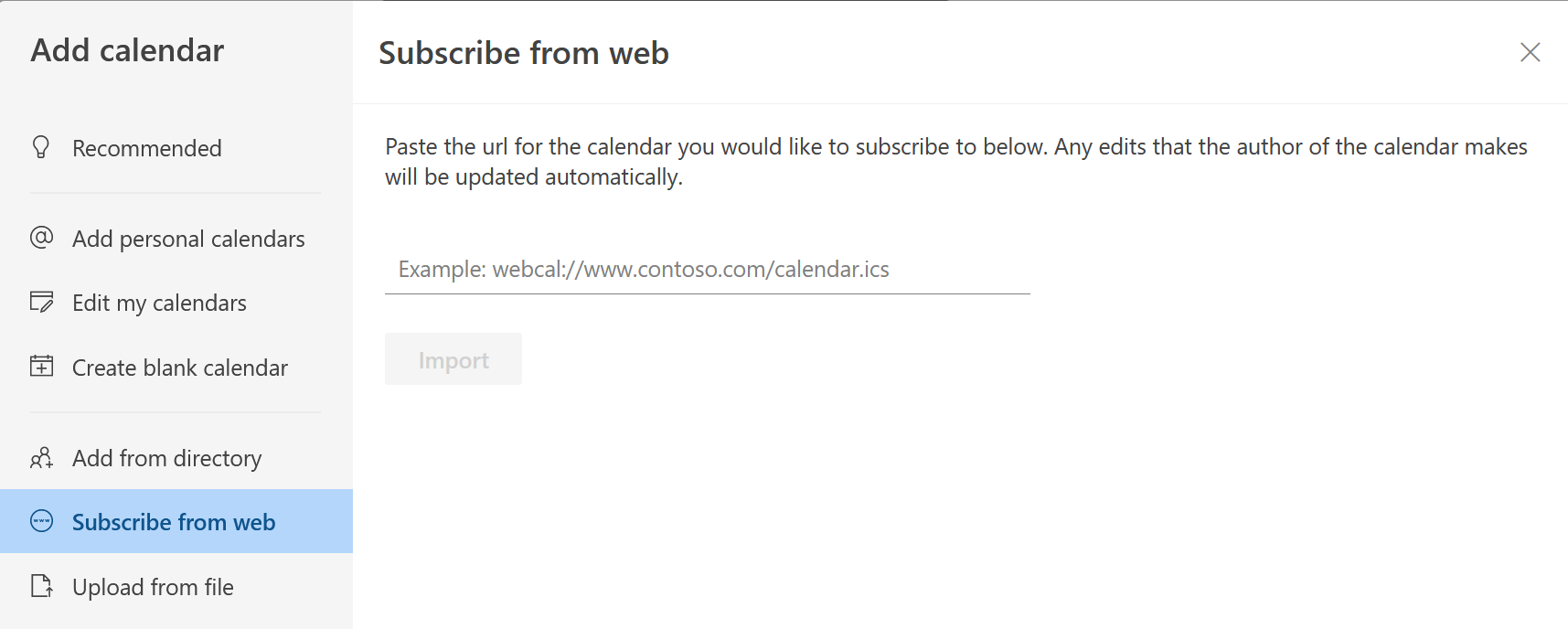 Byt nu till ditt Outlook-konto. Gå till kalendervyn, välj Lägg till kalender och sedan Från Internet….