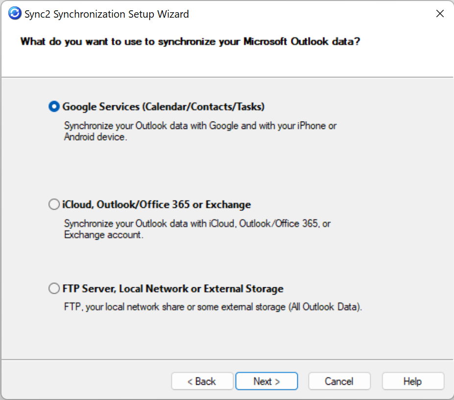 Steg 2: Installera och kör programmet på din dator. Synkroniseringsguiden erbjuder olika alternativ beroende på vilka konton du vill synkronisera. För att länka Outlook- och Google-kalendrar väljer du Google Services.