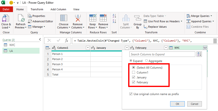 Steg 6: För att göra tabellens innehåll synligt, klicka på pilsymbolen under tabell 2 och avmarkera rutorna bredvid kolumnerna med samma data (i detta fall Kolumn1). Markera rutorna för olika data som ska läggas till.