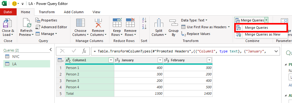 Steg 4: Klicka på Slå ihop frågor och sedan igen i rullgardinsmenyn.