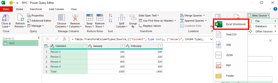 Steg 2: Power Query Editor öppnas nu med innehållet i den tabell du valt. För att lägga till innehållet i den andra tabellen klickar du på Ny källa i det övre högra hörnet av Excel-fönstret. Välj Fil och sedan Excel-arbetsbok.