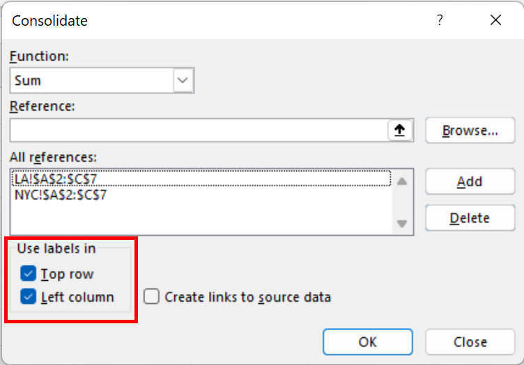 - I fältet Referens väljer du de celler du vill slå samman och klickar på Lägg till för att inkludera dem i referenserna.
