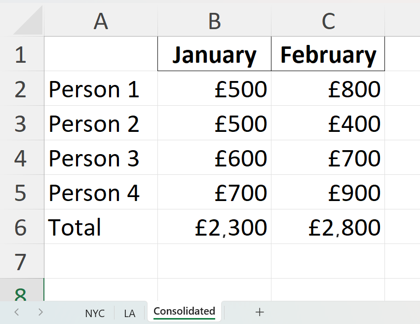 Steg 8: Nu ser du de sammanslagna uppgifterna från de andra Excel-kalkylbladen i det nya kalkylbladet.