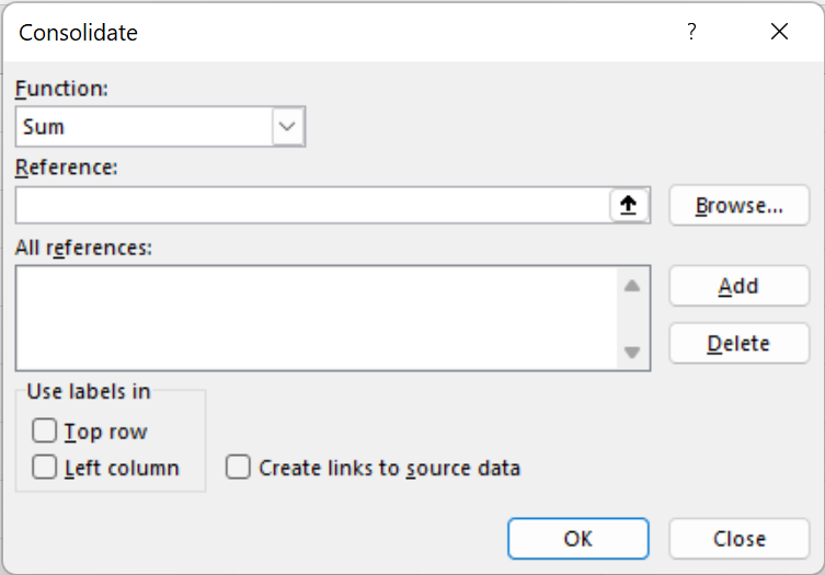 Steg 3: Menyn Konsolidera öppnas. Här kan du välja hur Excel ska slå samman data (dvs. summa, medelvärde, max). I det här exemplet väljer vi alternativet Summa så att värdena läggs ihop.