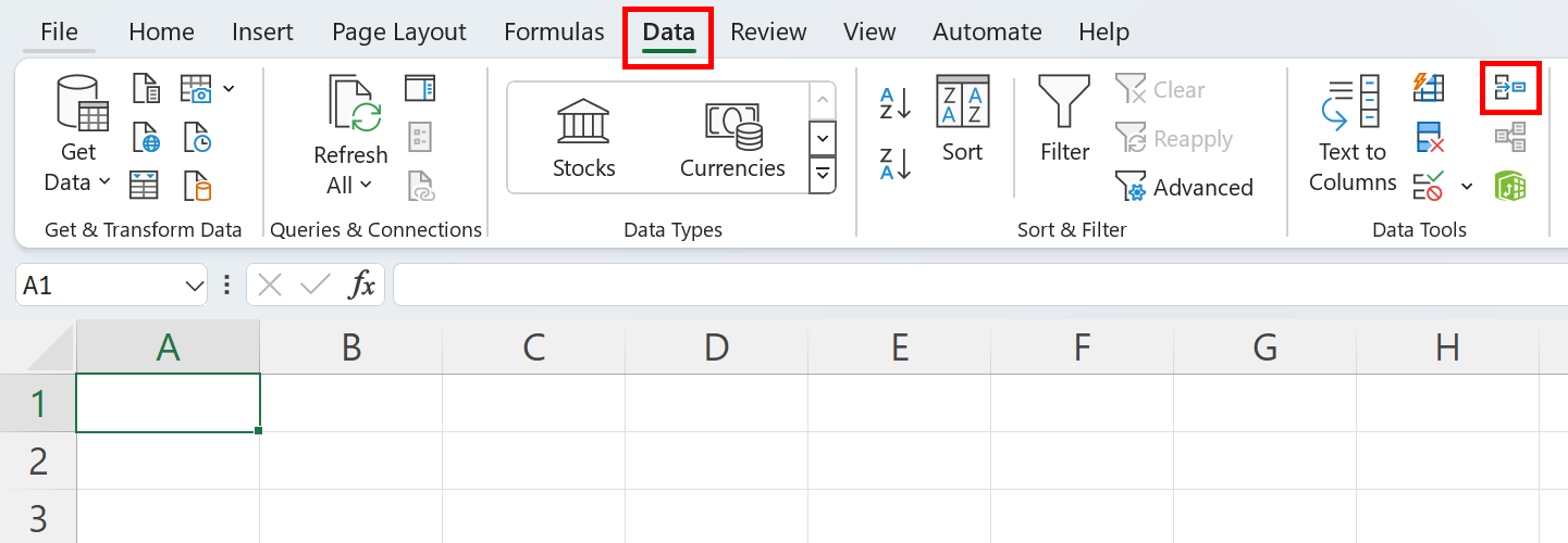 Steg 2: I det nya kalkylbladet väljer du den cell där du vill slå samman data. I det här exemplet har vi valt cell A1. Klicka nu på Data i menyn högst upp i fönstret. I avsnittet Dataverktyg väljer du symbolen för Konsolidera.