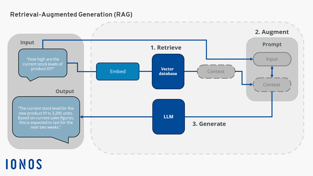 Den hämtade informationen infogas i sammanhanget för den ursprungliga frågan med hjälp av tekniska metoder för att utvidga frågan. Detta inkluderar både den ursprungliga frågan och relevanta data. Detta gör det möjligt för LLM att generera ett mer precist och informativt svar.