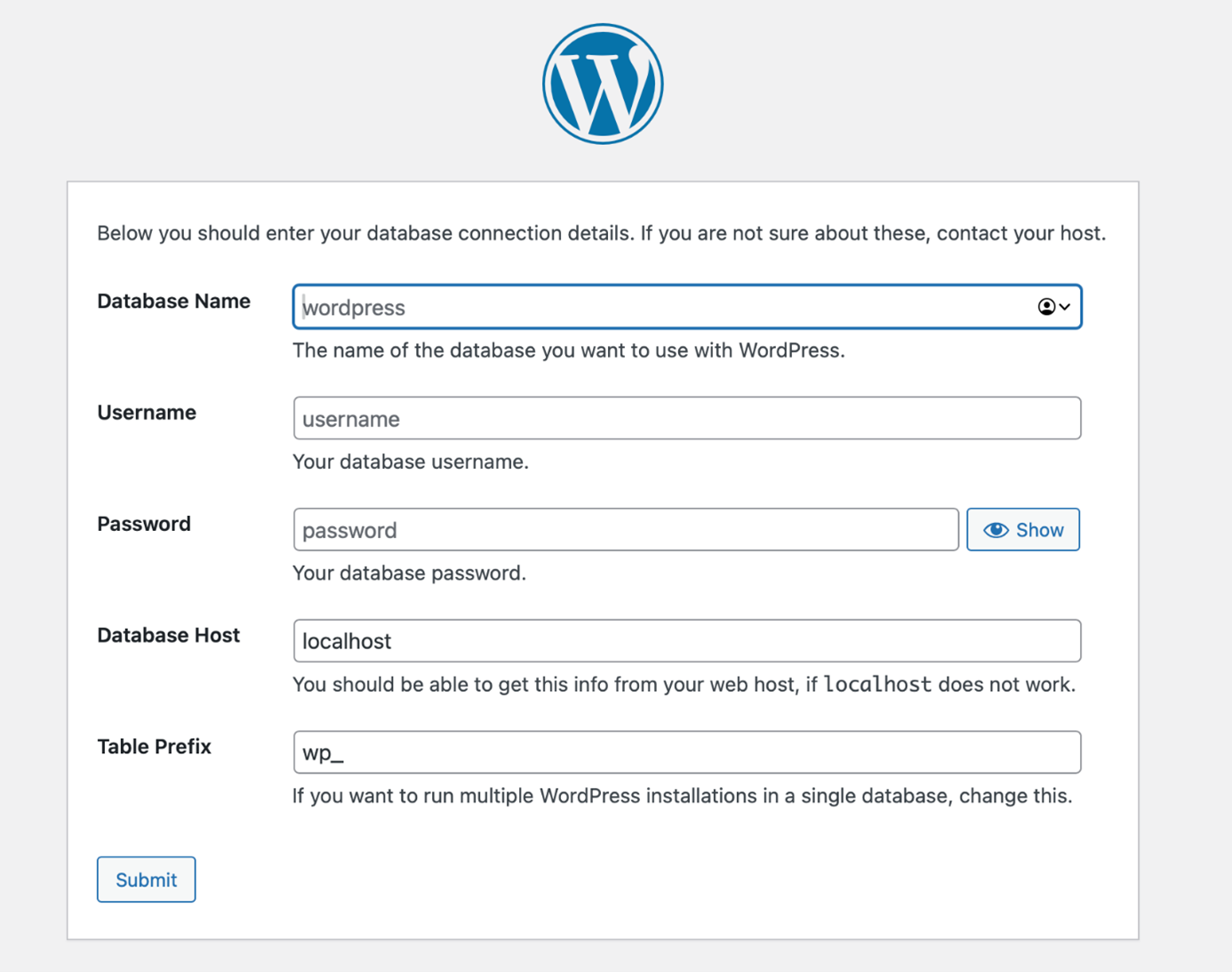 -e WORDPRESS_DB_HOST=[hostname]: Standardinställningen är IP-adressen och porten för den länkade MySQL/MariaDB-containern. Med denna variabel kan du ansluta till en MySQL/MariaDB-databas på en annan server.-e WORDPRESS_DB_USER=[username]: Standardvärdet ärroot.-e WORDPRESS_DB_PASSWORD=[password]: Standardvärdet ärMYSQL_ROOT_PASSWORDfrån den länkade MySQL/MariaDB-containern.-e WORDPRESS_DB_NAME=[name]: Standardvärdet är"wordpress".