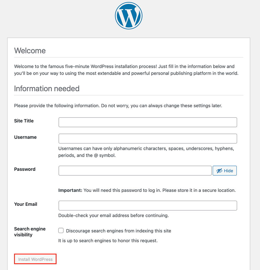 Klicka sedan på knappen Installera WordPress för att slutföra installationen.