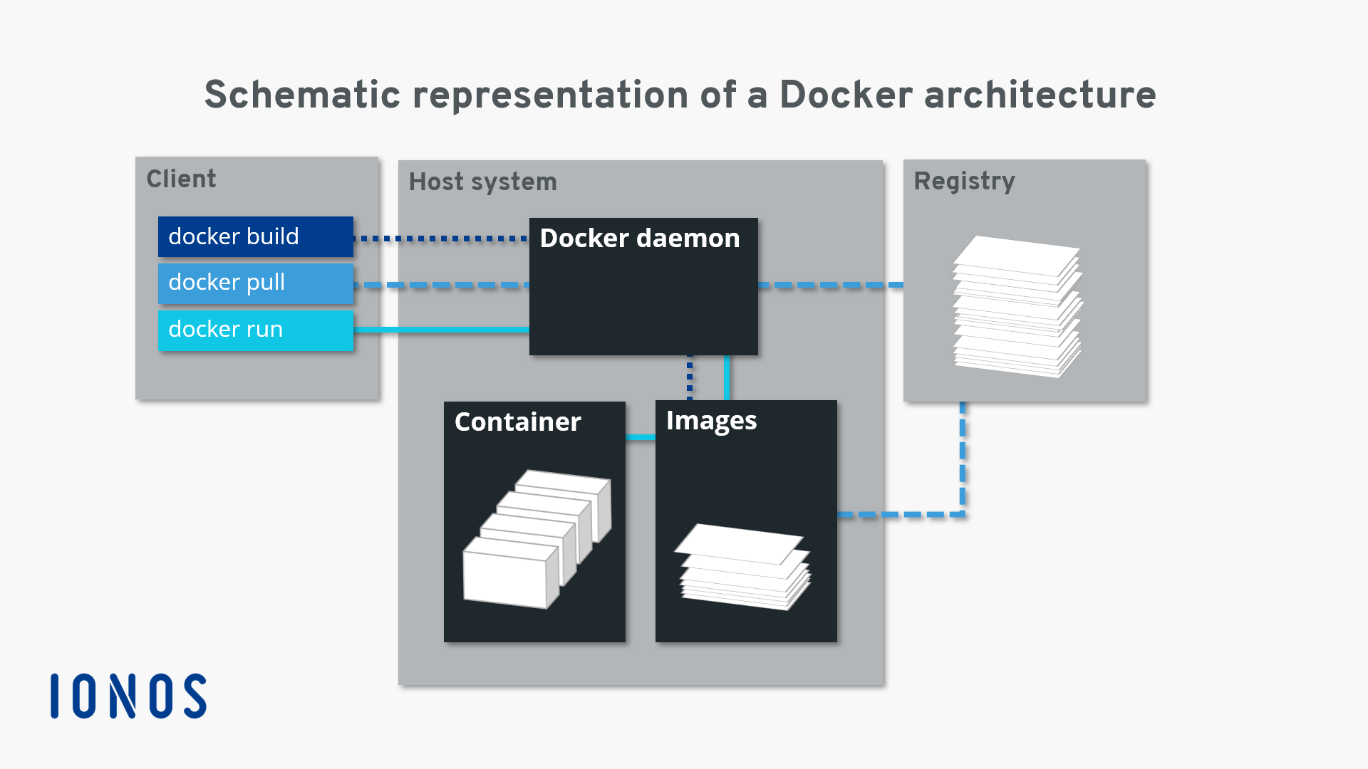 Kommandot docker build instruerar Docker-daemonen att skapa en bild (prickad linje). För detta måste en motsvarande Dockerfile finnas tillgänglig. Om bilden inte ska skapas, utan istället laddas från ett arkiv i Docker Hub, används kommandot docker pull (streckad linje). Om Docker-daemonen instrueras via docker run att starta en container, kontrollerar bakgrundsprogrammet om motsvarande containerbild finns tillgänglig lokalt. Om så är fallet körs containern (heldragen linje). Om daemonen inte kan hitta bilden initierar den automatiskt en hämtning från arkivet.