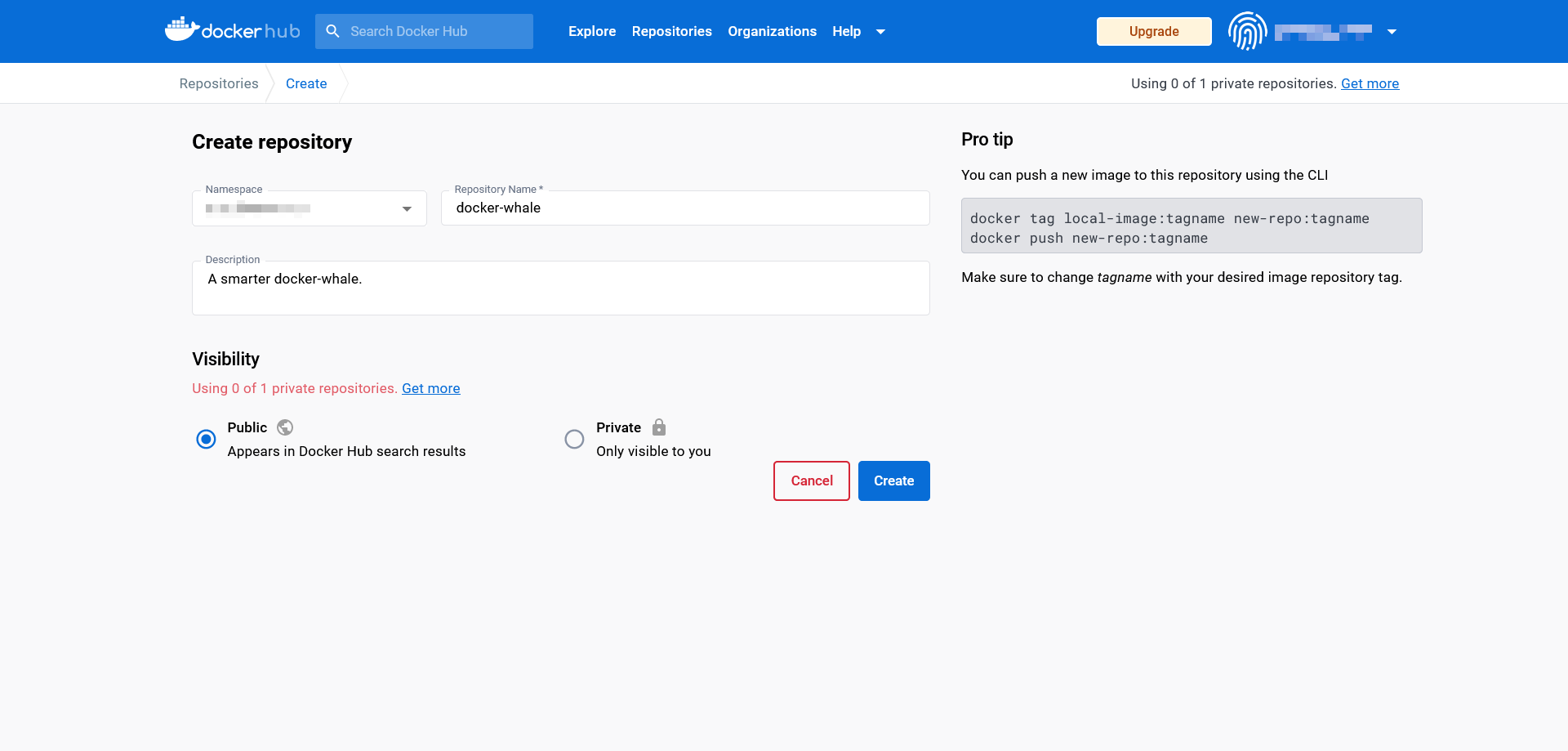 - Skapa ett arkiv: Logga in på Docker Hub med ditt Docker-ID och ditt personliga lösenord och skapa ett offentligt arkiv med namnet docker-whale.