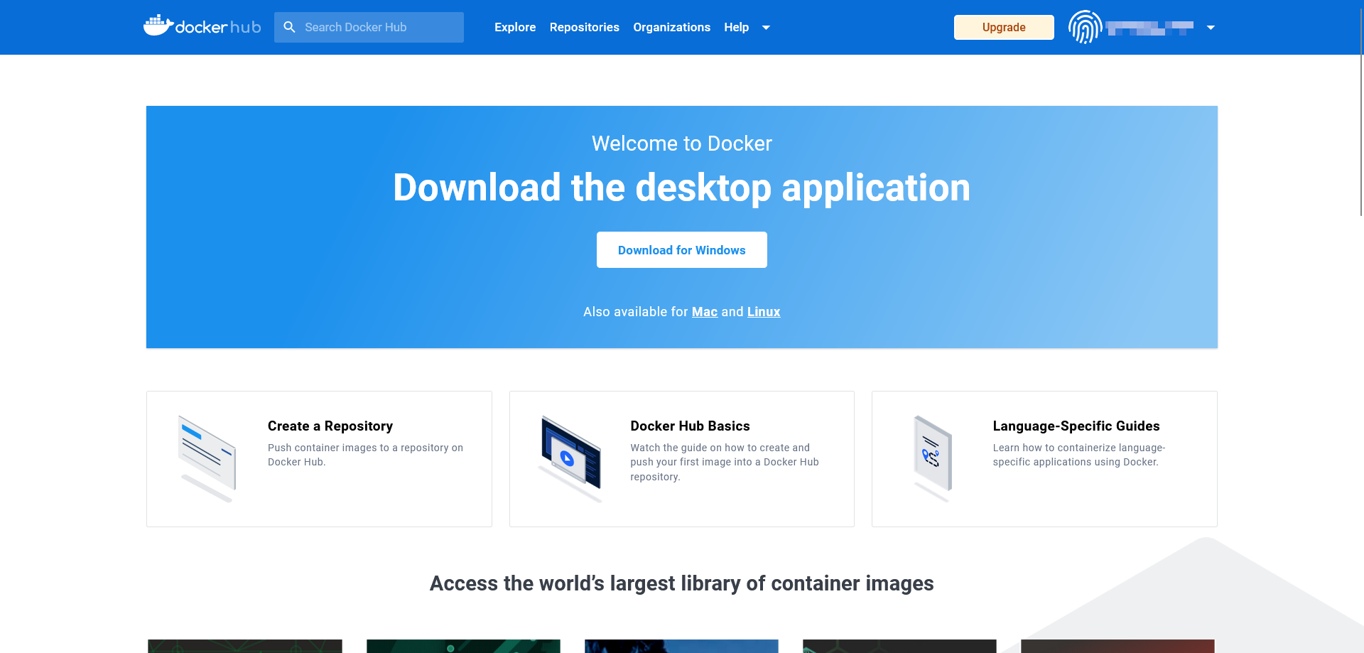 Docker-projektets onlinetjänster är tillgängliga direkt efter att du registrerat dig i webbläsaren. Här kan du skapa arkiv och arbetsgrupper eller söka efter offentliga resurser i Docker Hub med hjälp av funktionen ”Explore”.