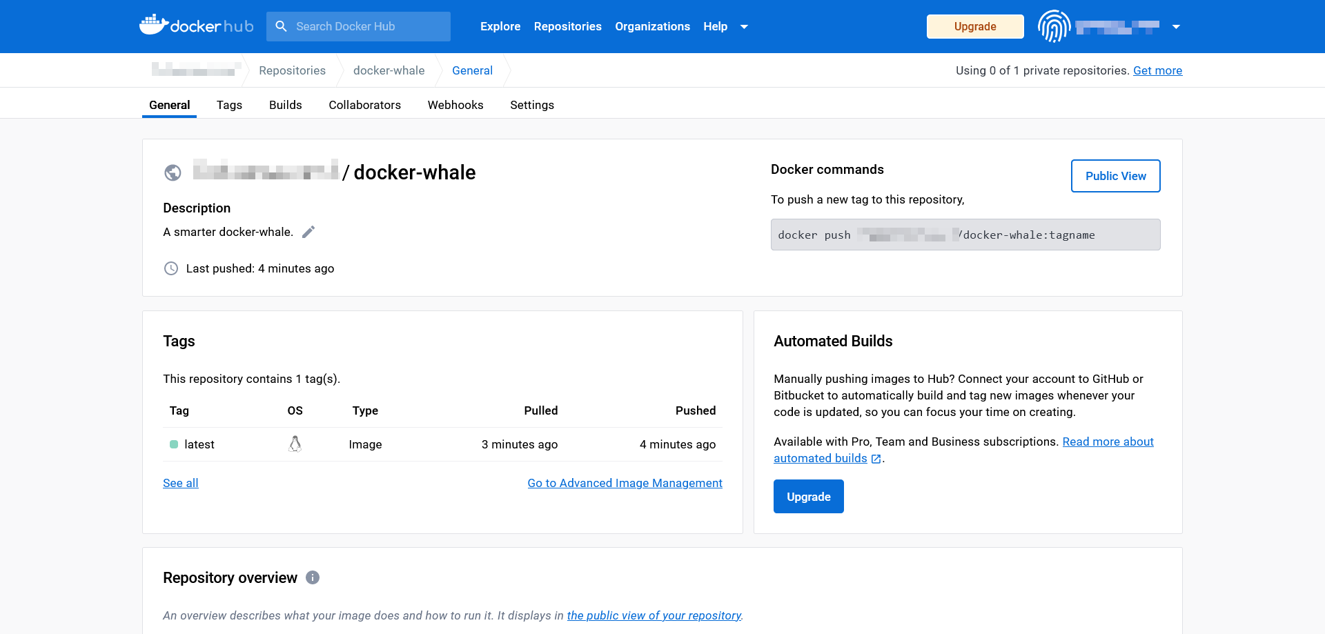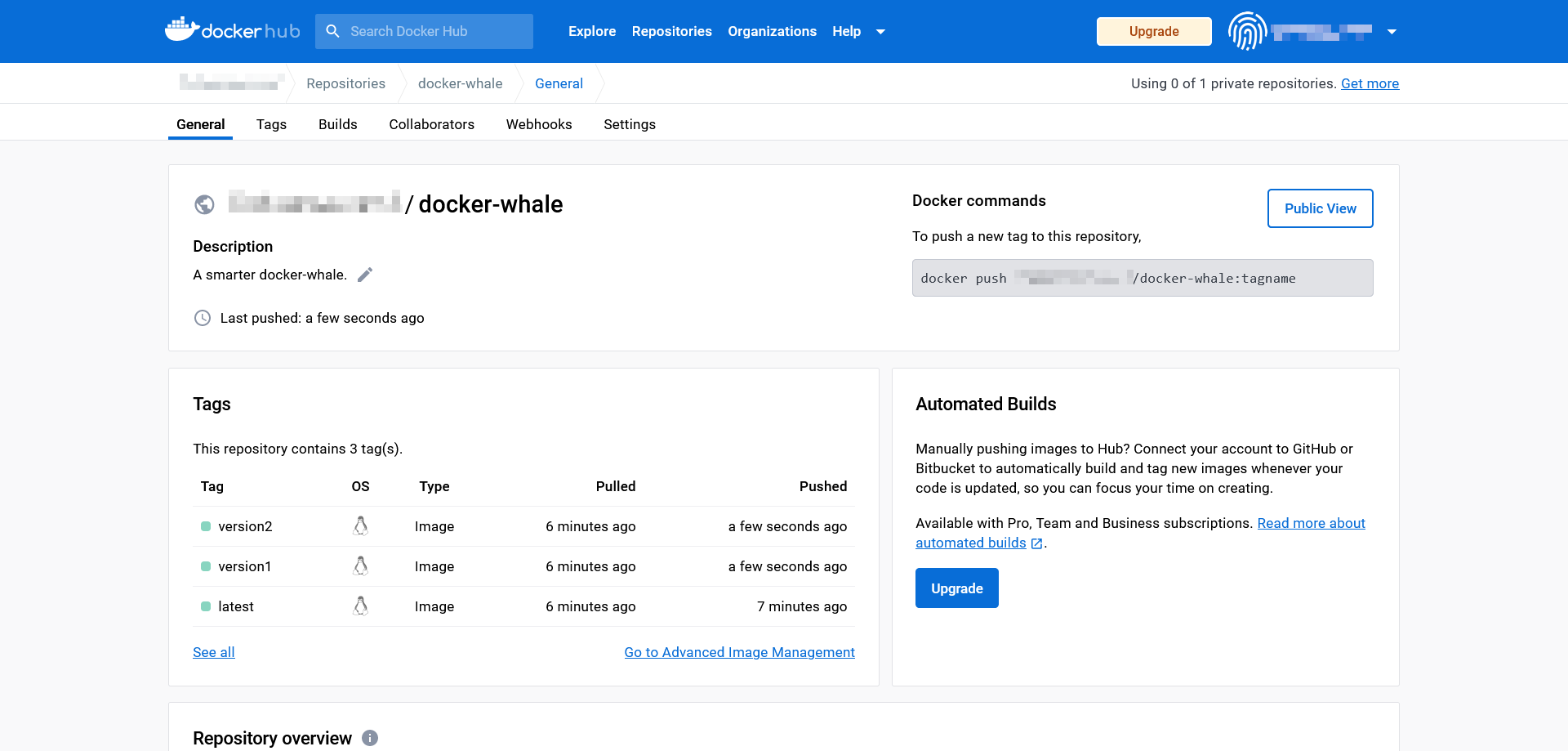 [Namespace]/docker-whale:version2En översikt över de olika bildversionerna finns i Docker Hub-arkivet under fliken “Tags”.