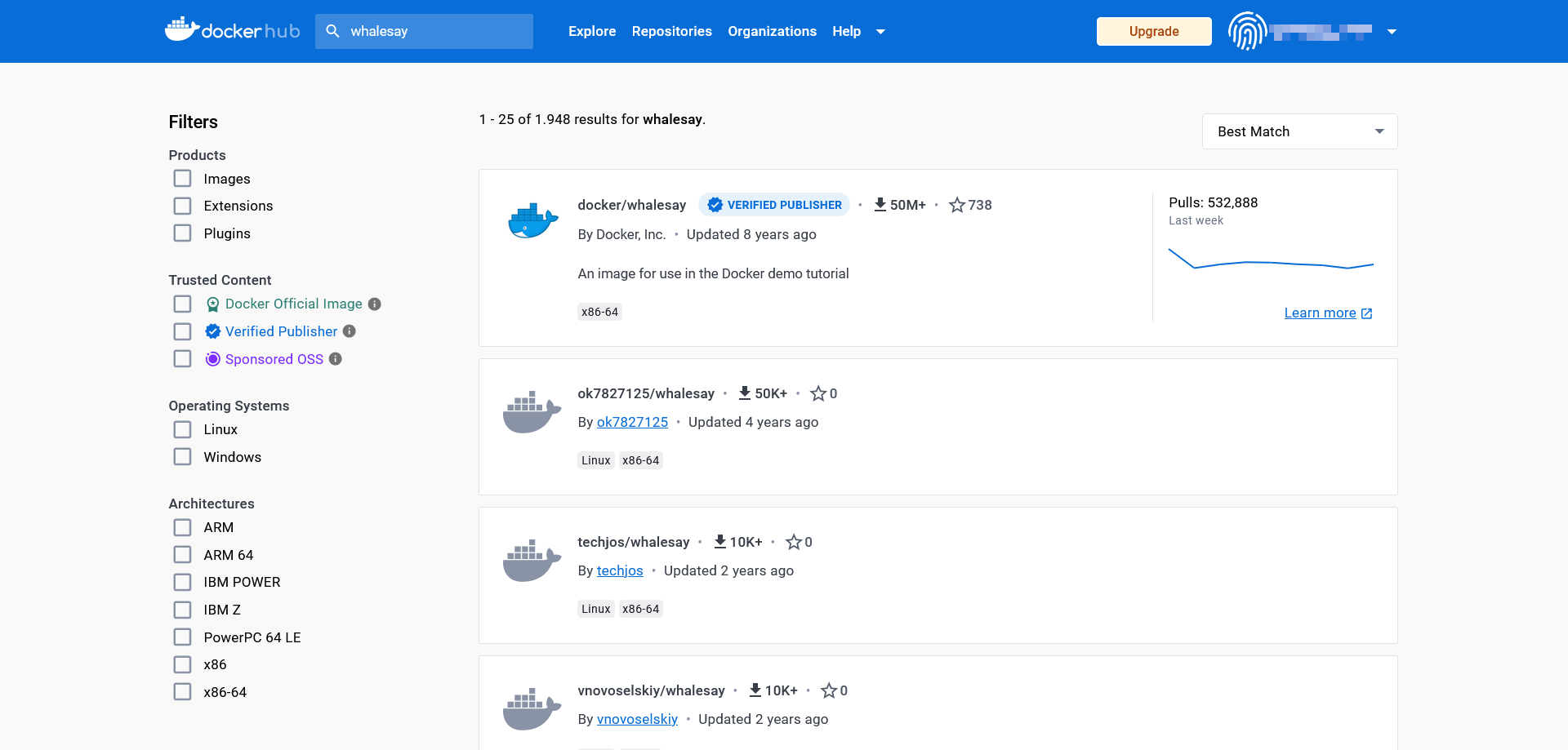 I sökresultaten klickar du på resursen med titeln docker/whalesay för att komma åt det offentliga arkivet för den här bilden.