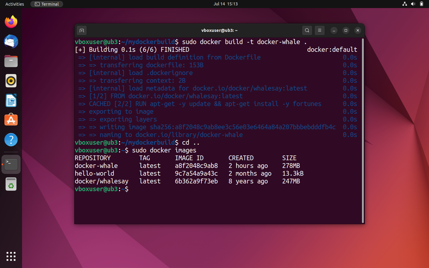 När RUN-kommandot är klart stoppar Docker-daemonen den container som skapats för det, tar bort den och startar en ny tillfällig container för lagret i CMD-uttrycket. I slutet av skapandeprocessen avslutas och tas även denna tillfälliga container bort. Docker ger dig ID-numret för den nya bilden:
