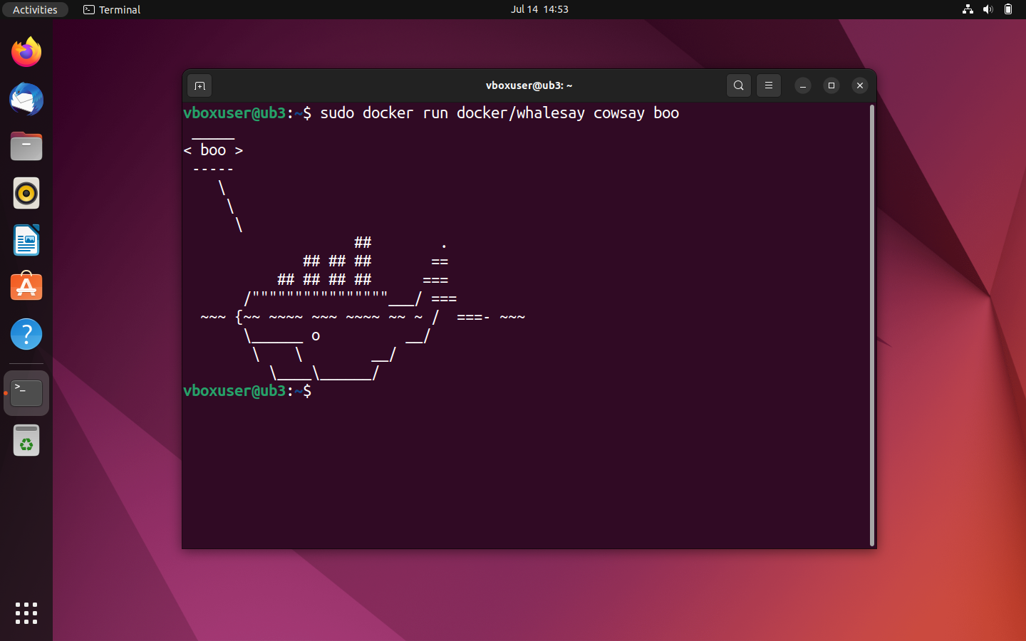 Om bilden docker/whalesay körs, visar skriptet en ASCII-grafik i form av en val samt textmeddelandet ”boo”, som skickas med kommandot cowsay i terminalen.
