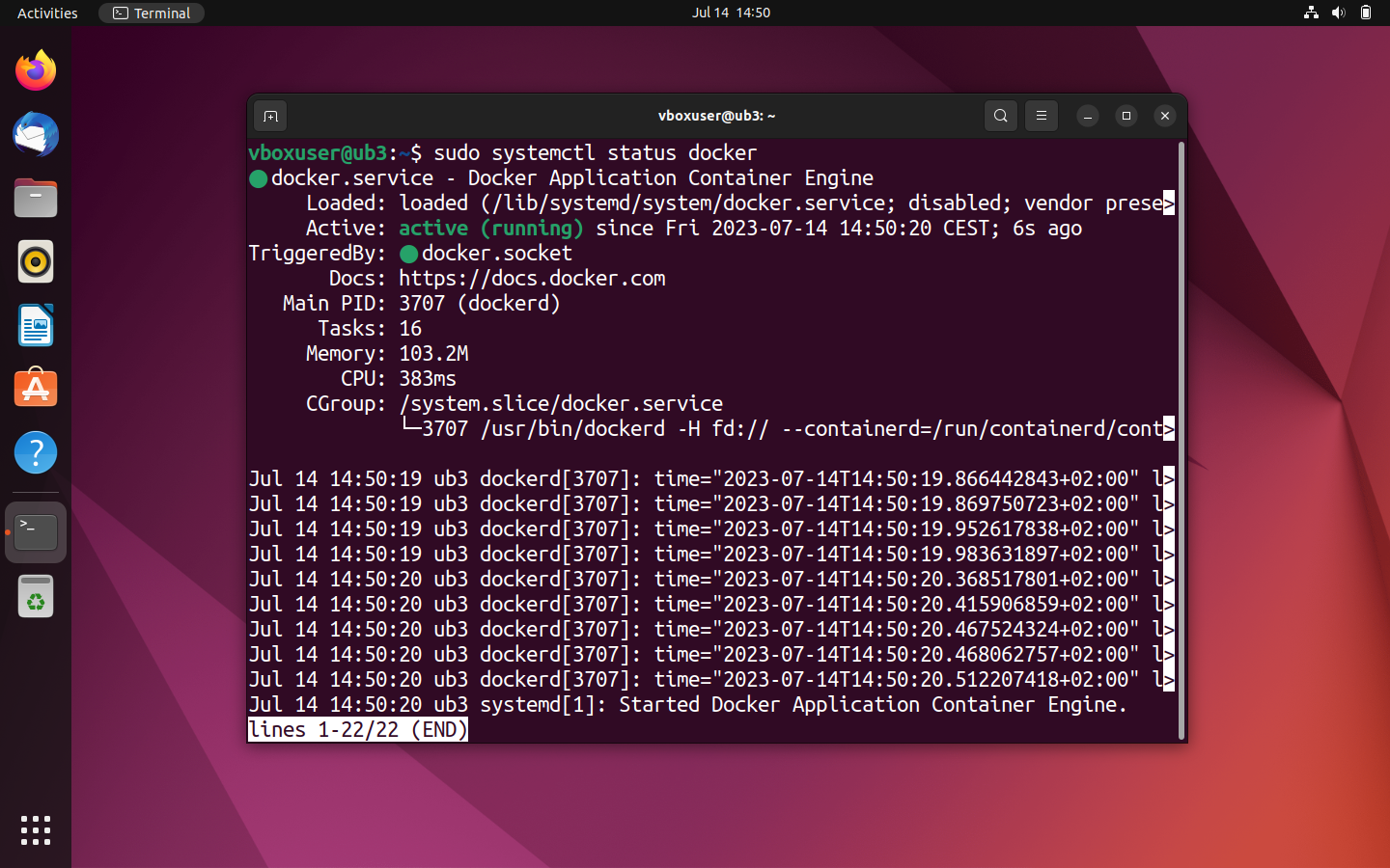 sudo systemctl status dockerbashOm Docker-motorn på ditt Ubuntu-system är aktiv bör utdata i terminalen se ut som på följande skärmdump: