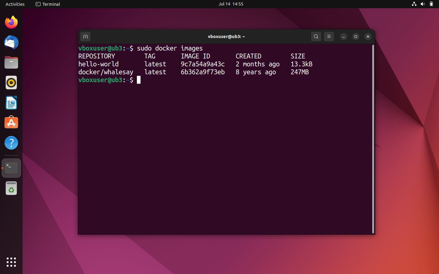 sudo docker ImagesbashDe borttagna elementen ska inte längre visas i terminalutmatningen. Använd nu kommandot pull i arkivet för att ladda ner en ny kopia av bilden från Docker Hub.