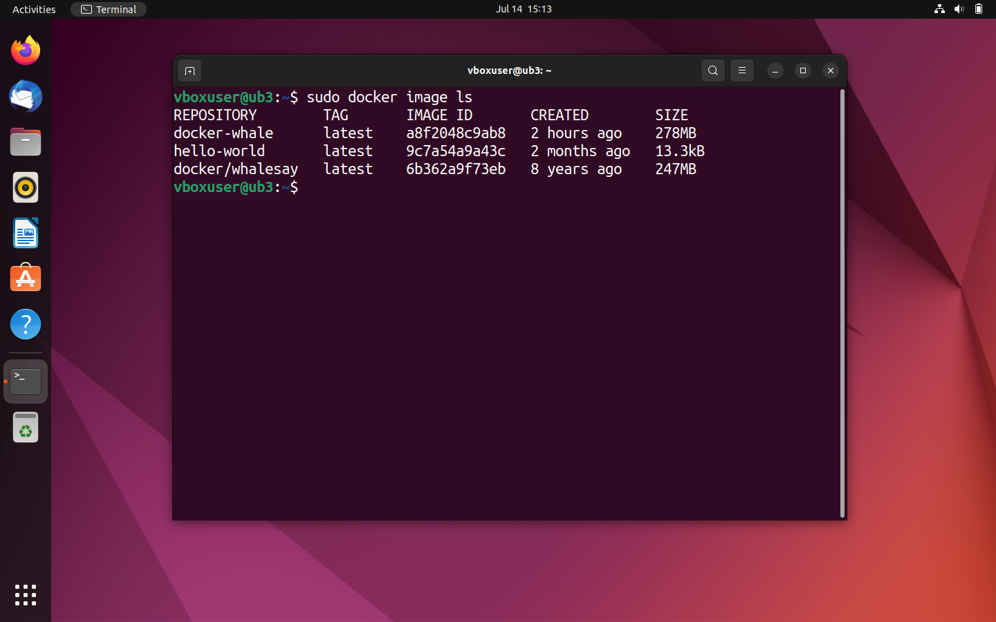 sudo docker imagebashKommandot docker images (alternativ docker image ls) visar alla lokala bilder inklusive filstorlek, tagg och bild-ID.