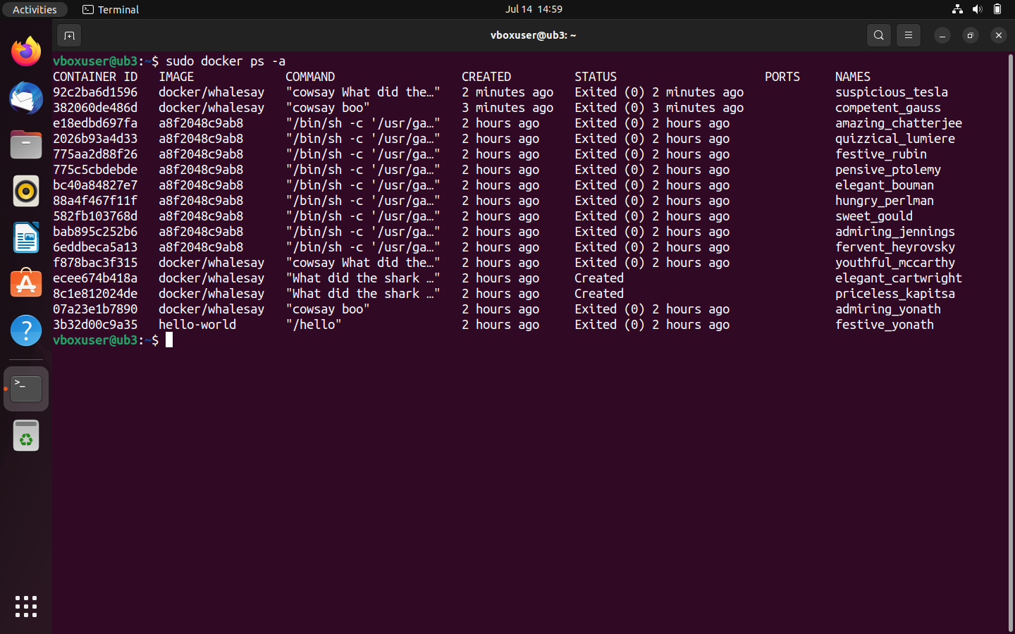 Terminalutmatningen innehåller information som respektive container-ID, den underliggande bilden, kommandot som kördes när containern startades, tidpunkten då containern startades och status.