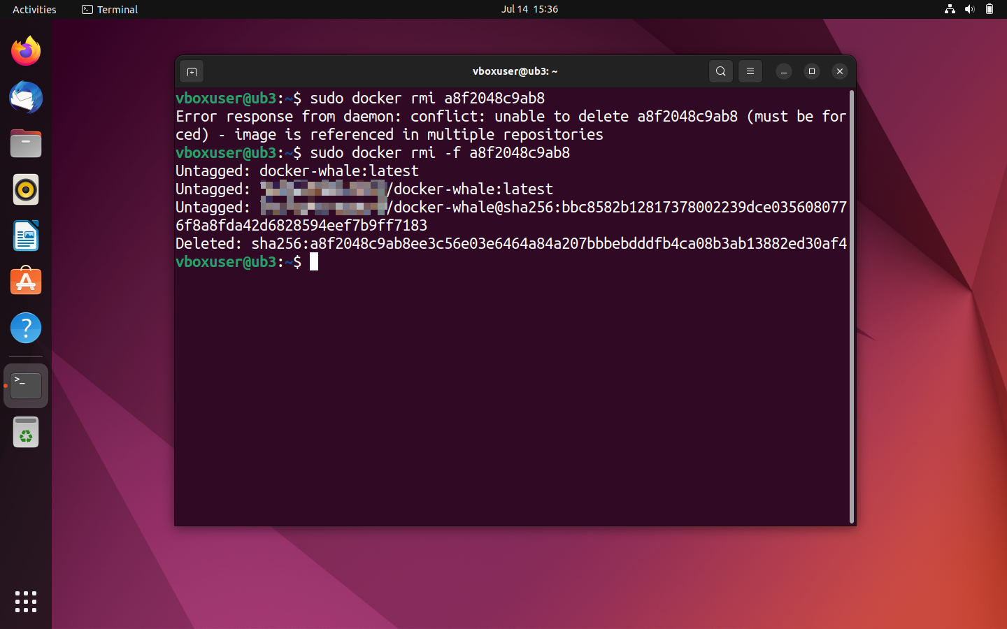 För att radera den lokala Docker-bilden använder du kommandoradsdirektivet docker rmi i kombination med motsvarande bild-ID. Detta bestäms som vanligt via docker images. Om Docker loggar en konflikt, t.ex. eftersom ett bild-ID används i flera arkiv eller används i en container, upprepar du kommandot med alternativet --force (-f förkortat) för att tvinga fram en radering.