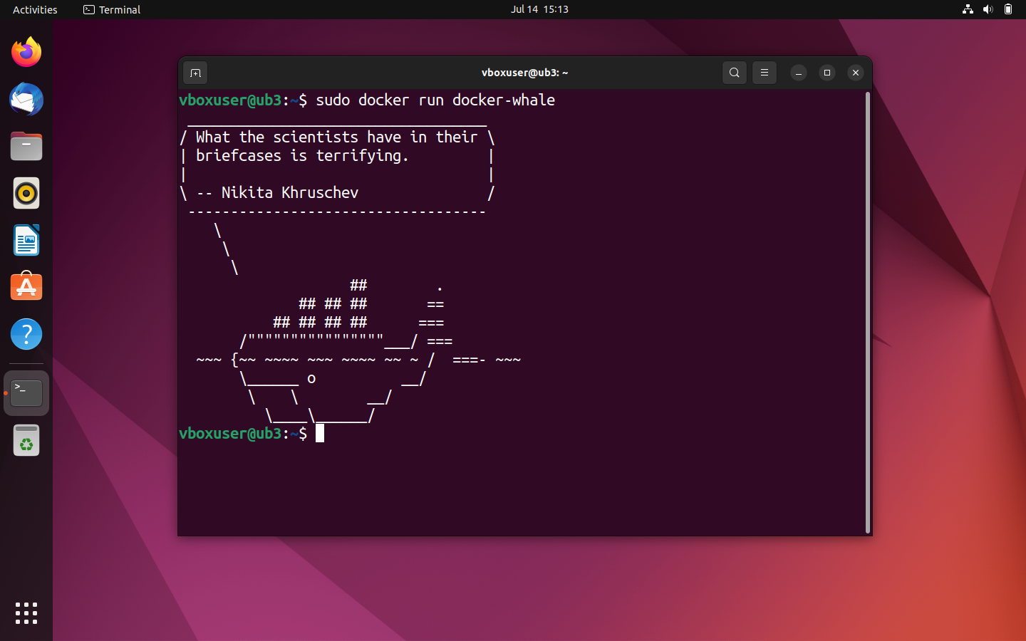 Precis som cowsay erbjuder även Dockers whalesay möjligheten att ingripa i programsekvensen för att påverka textutmatningen i terminalen. Testa denna funktion genom att ersätta “boo” i utmatningskommandot med valfri sträng eller med ett dåligt valskämt, till exempel.