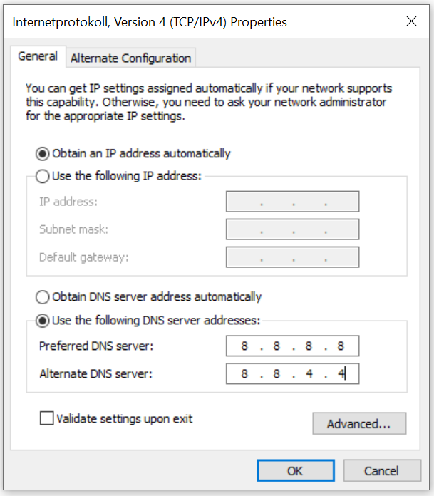 Alternativ DNS-server: 8.8.4.4