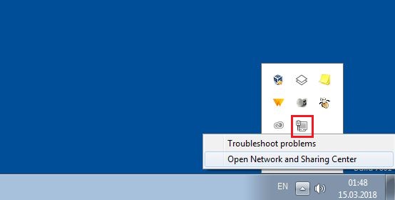 Steg 1: Gå till Nätverks- och delningscenter. Detta kan öppnas antingen via kontrollpanelen (Startmenyn -> Kontrollpanelen) eller via nätverksanslutningssymbolen i aktivitetsfältets meddelandefält. När du har hittat ikonen klickar du på den med höger musknapp och väljer alternativet Öppna nätverks- och delningscenter.