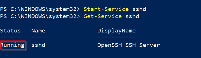 Get-Service sshdpowershellKör statusen indikerar att sshd fungerar som det ska.