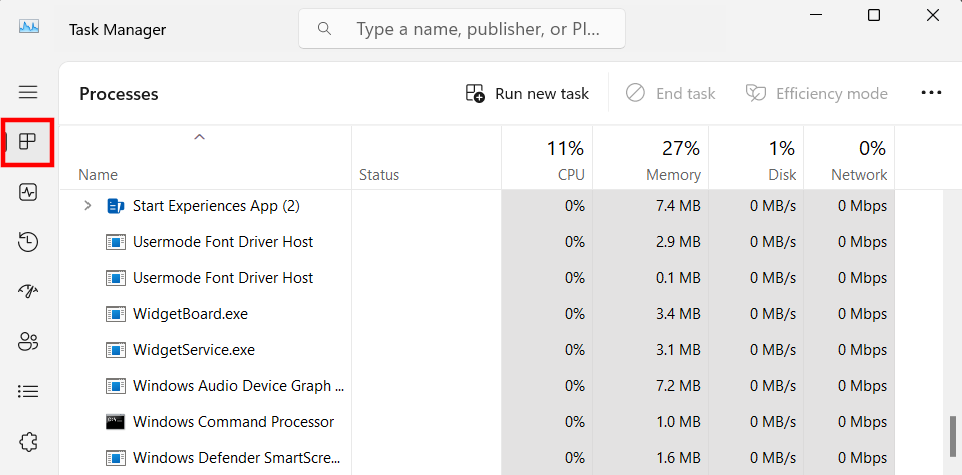 För att använda Aktivitetshanteraren för att rensa RAM-minnet i Windows 11 och andra versioner, välj fliken “Processer”: