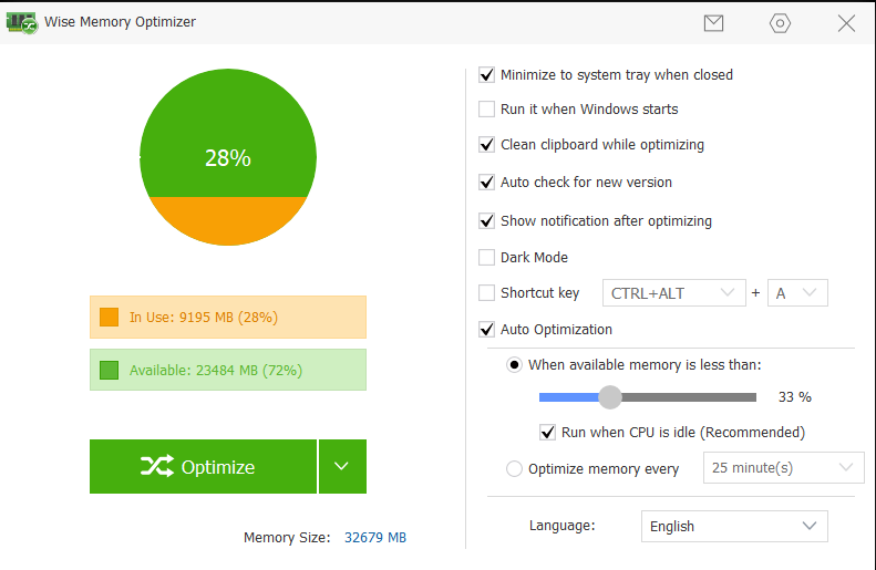 I inställningarna för Wise Memory Optimizer kan du aktivera automatisk optimering. Med hjälp av skjutreglaget kan du ange minnesgränsen för när automatisk rensning ska ske (till exempel när mindre än 33 procent av minnet är tillgängligt).