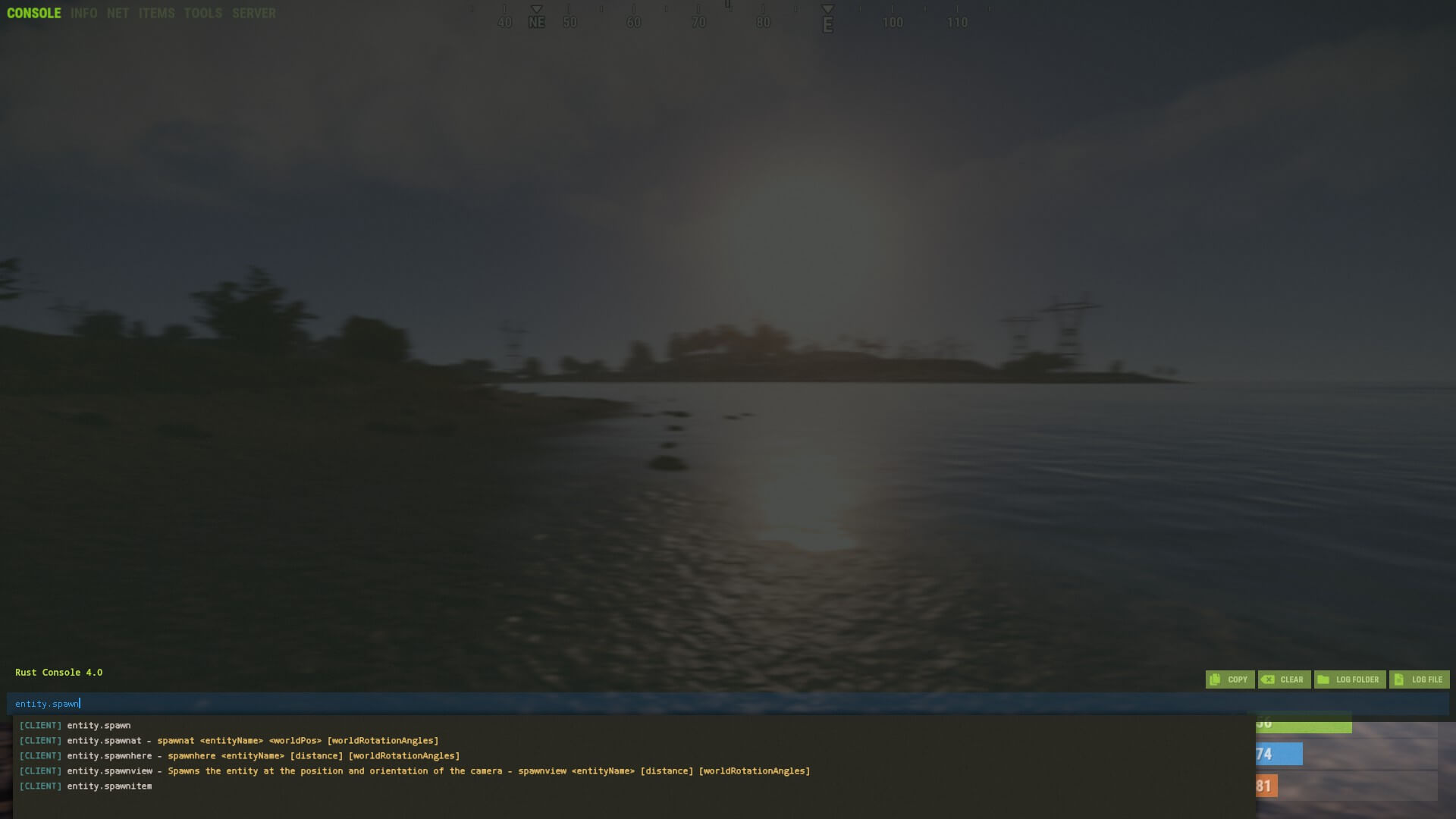 In the in-game console, you’ll automatically receive suggestions for possible Rust cheats