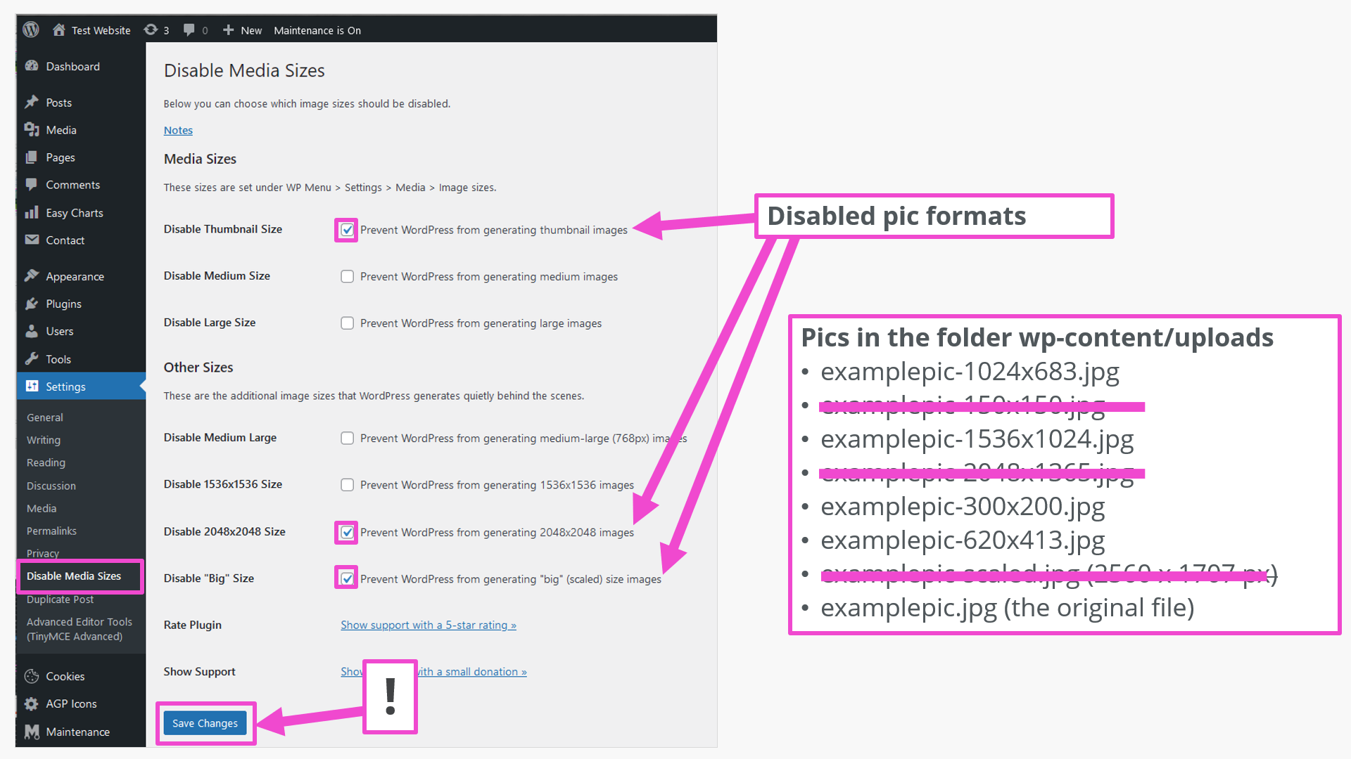 Det enklaste sättet att inaktivera standardbildstorlekarna är att använda pluginet ”Disable Media Sizes ”. I dess inställningar listas också alla sju genererade bildformat.