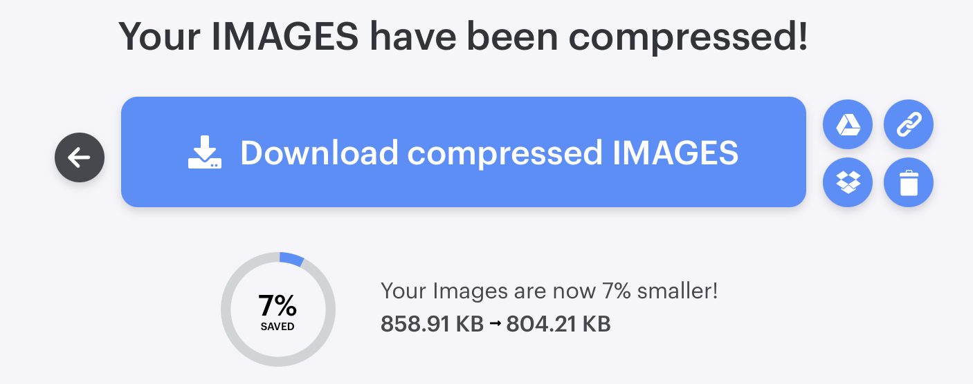 Även om iLoveIMG endast har ett enda standardkomprimeringsläge, erbjuder verktyget flera olika exportalternativ. Det är inte bara möjligt att ladda ner resultaten till den lokala hårddisken, utan också att ladda upp dem till Google Drive och Dropbox och vidarebefordra en nedladdningslänk till de komprimerade bilderna. Om du inte är nöjd med komprimeringsresultatet kan du helt enkelt radera det genom att klicka på papperskorgsikonen.