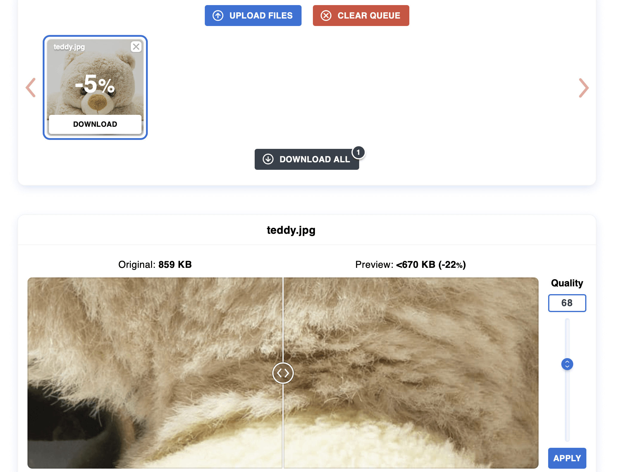 För att hjälpa dig att hitta de bästa möjliga inställningarna visar Optimizilla miniatyrbilder av originalet och dess komprimerade motsvarighet. Dessutom anger verktyget respektive filstorlek. Alla uppladdade bilder raderas automatiskt från leverantörens servrar efter en timme.