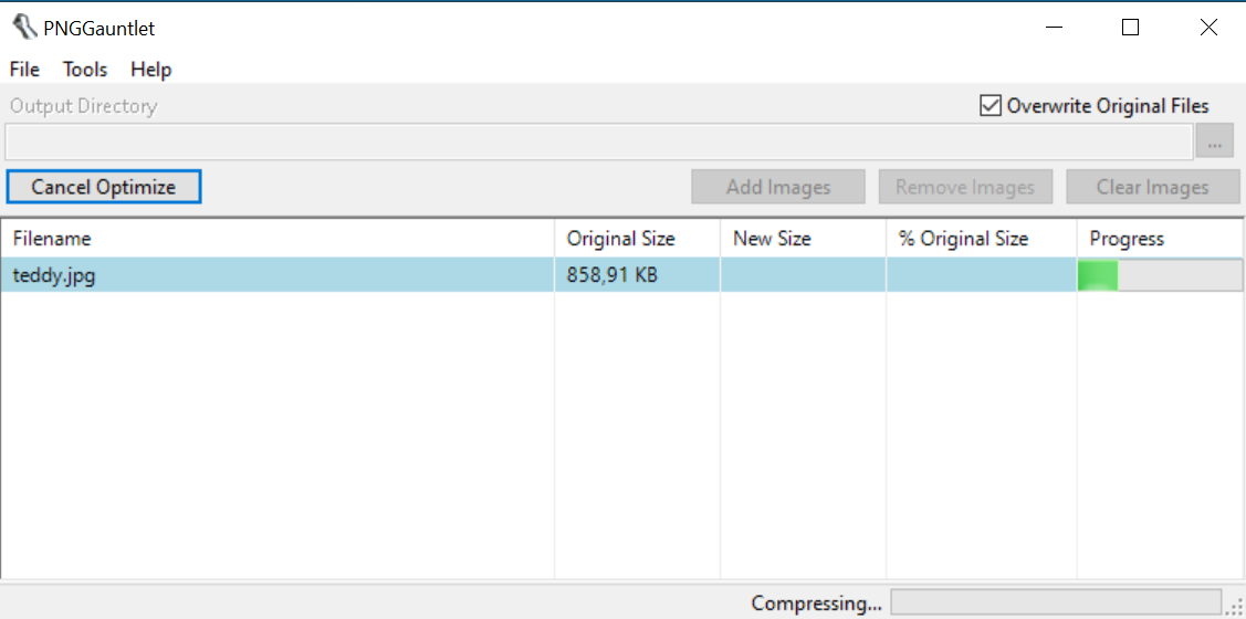 Det finns två sätt att komprimera dina bilder med PNGGauntlet. Du kan komma åt standardinställningarna genom att infoga en eller flera bilder och sedan trycka på “Optimera!”, eller så kan du först välja en individuell inställning genom att justera inställningarna för de tre implementerade verktygen genom att klicka på knappen med samma namn. Oavsett vilket sätt du väljer kommer det kostnadsfria verktyget att visa den nya storleken på bildfilen/bildfilerna ( jämfört med originalet) i procent efter att komprimeringen har genomförts.