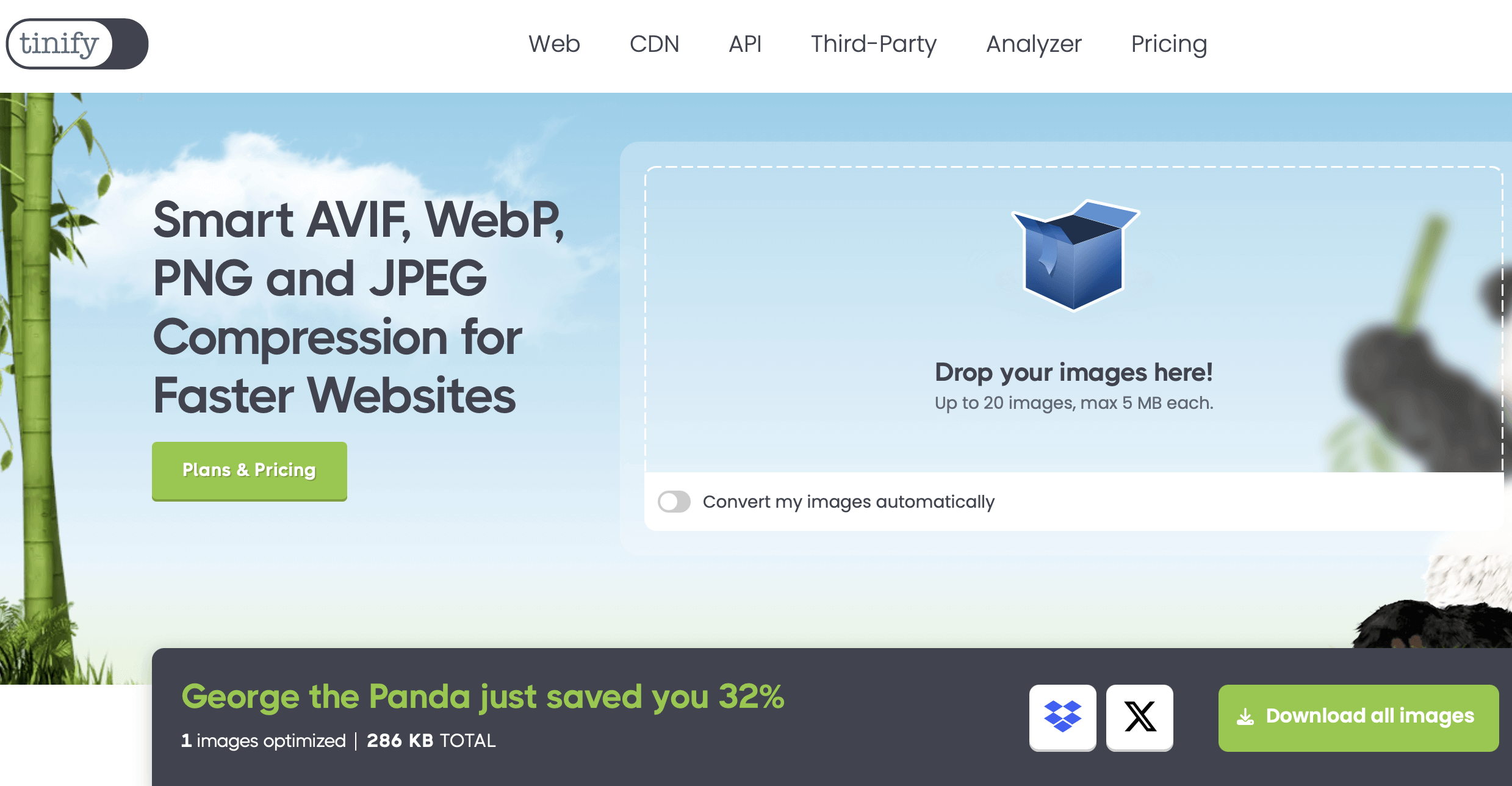 TinyPNG möjliggör – trots sitt namn – inte bara komprimering av PNG-filer, utan även JPEG- och WebP-filer. I den kostnadsfria standardversionen kan du optimera upp till 20 bilder i dessa tre format samtidigt, med en maximal filstorlek per bild på 5 megabyte.