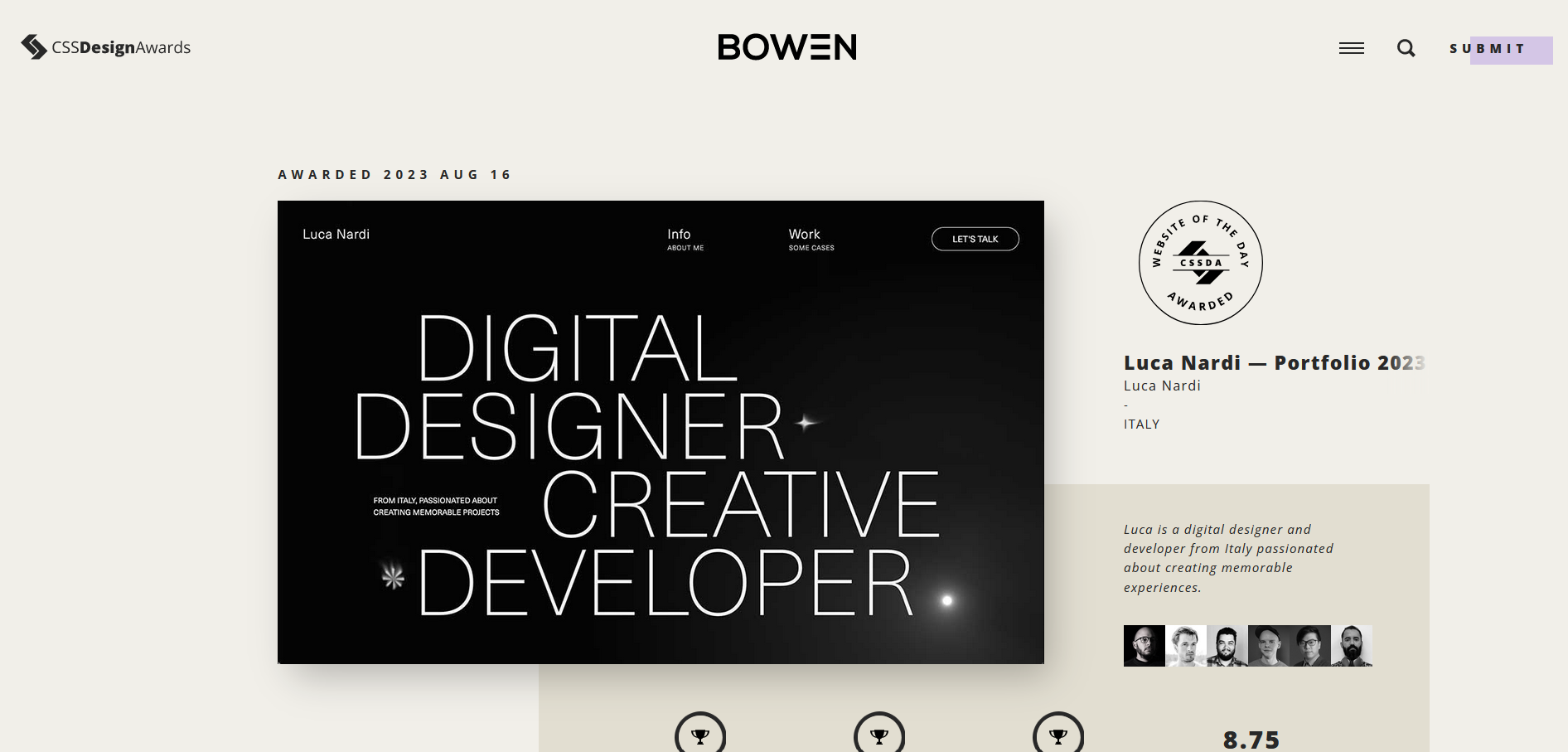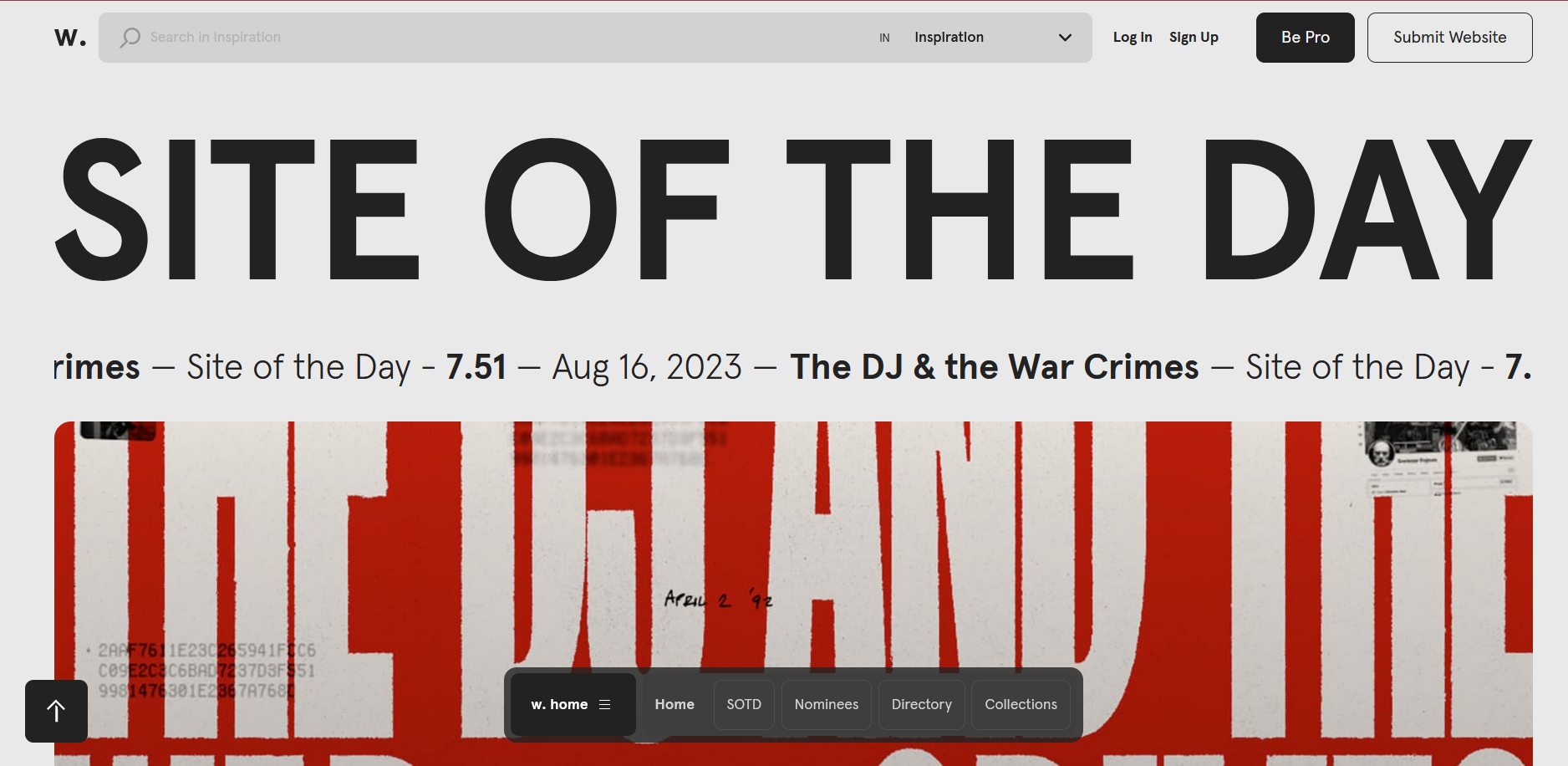 På Awwwards kan webbdesigners, utvecklare och kreativa byråer skicka in sina projekt för utvärdering av en professionell jury. De vinnande webbplatserna kan visas och besökas från plattformen, vilket gör att du kan upptäcka prisbelönta webbplatser och få insikter om god webbanvändbarhet när du söker inspiration för webbdesign.