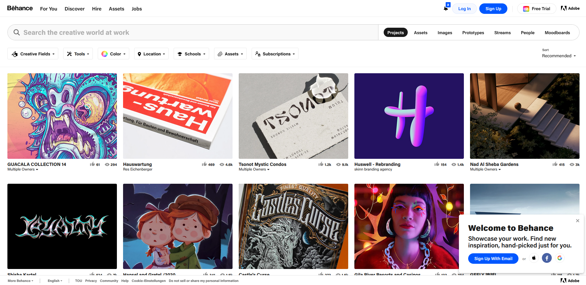 Behance erbjuder fotografer, grafiska konstnärer och designers en plattform för att dela sina verk med allmänheten. En fördel med webbplatsen är dess filterfunktion, som erbjuder användarna olika sökinställningar, såsom kreativa områden och verktyg som används för designarbetet. Att bläddra igenom de kreativa områdena är ett utmärkt sätt att få inspiration till webbdesign utan att behöva registrera sig.