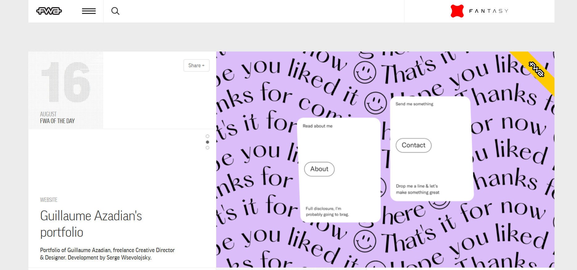 FWA står för “Favourite Website Awards”, ett erkänt prisprogram som har varit öppet för webbdesigners sedan maj 2000. I likhet med Awwwards presenterar FWA varje dag en “site of the day” (SOTD) och väljer varje månad en “site of the month” (SOTM). Vinnarna kan sedan delta i People’s Choice Award (PCA) i slutet av året.