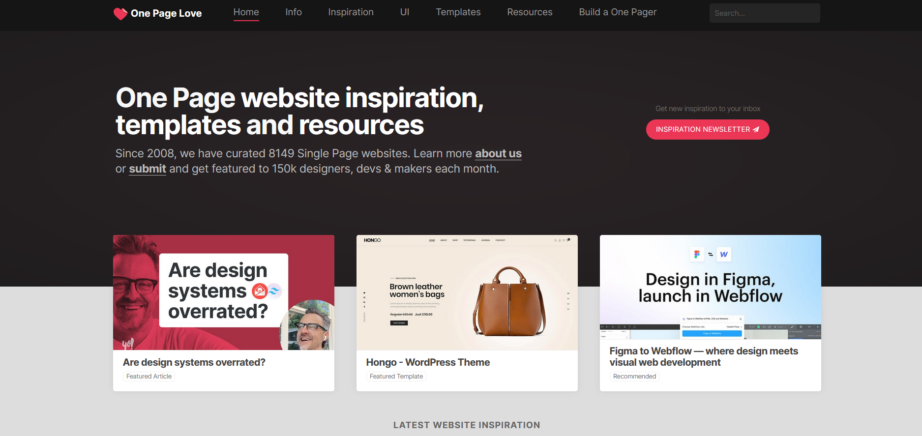 One Page Love är, som namnet antyder, en källa till inspiration för webbdesign av en-sidiga webbplatser. Den erbjuder användarna 8 000 exempel som visar aktuella trender inom webbdesign, såsom centralt delade layouter och användarcentrerad design. Om du letar efter inspiration till layouten för din en-sidiga app är One Page Love rätt plats för dig. Ett annat plus är att One Page Love erbjuder användarna en rad resurser med artiklar, ikonsatser, mallar och handledningar.