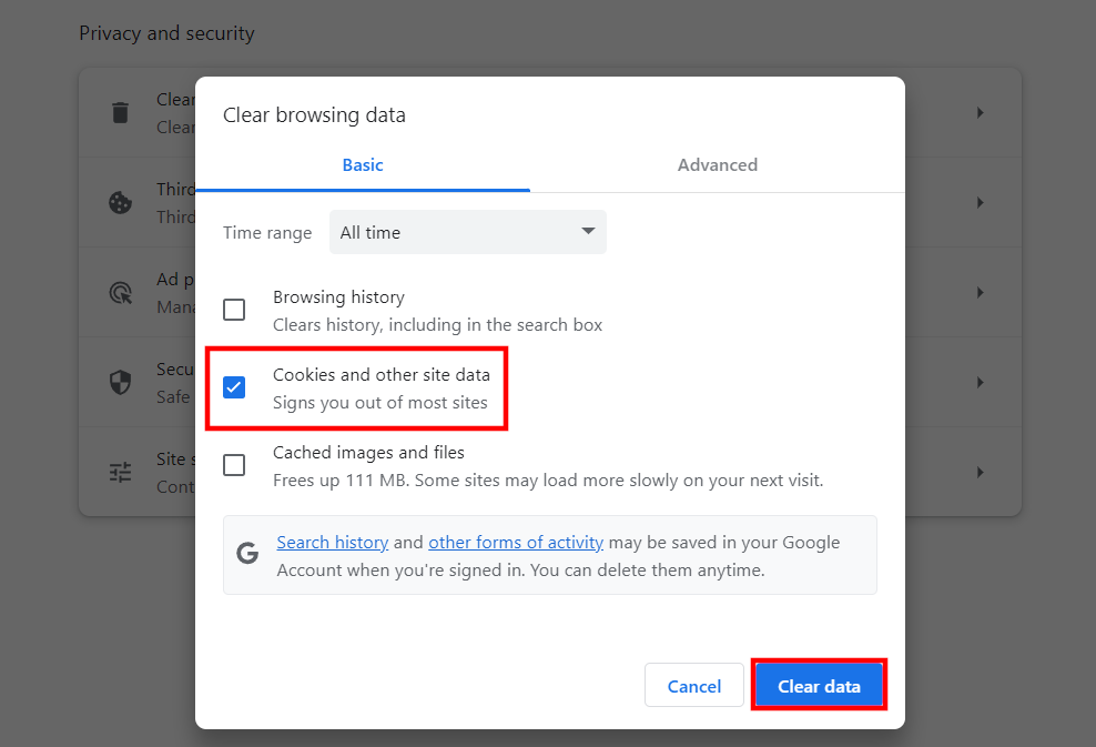 - Välj alternativet “Cookies och webbplatsdata” och klicka sedan på “Rensa data”. Du kan också rensa cacheminnet genom att välja “Webbhistorik”.