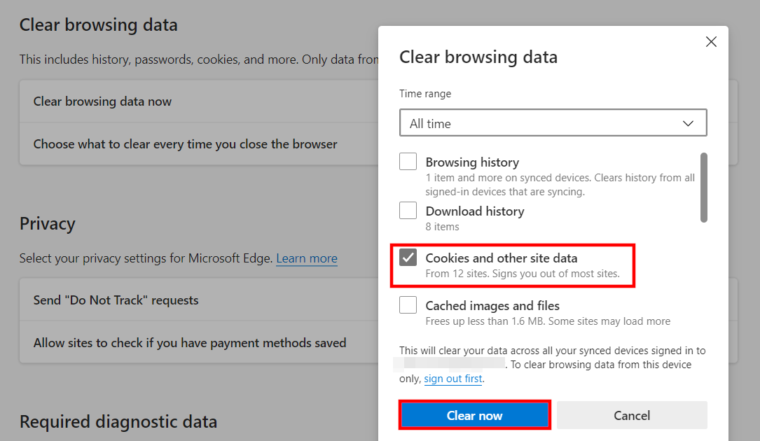 - Markera rutan bredvid “Cookies och annan webbplatsdata” och klicka på “Rensa nu” så att Edge raderar alla cookies (tidsintervall: All tid).