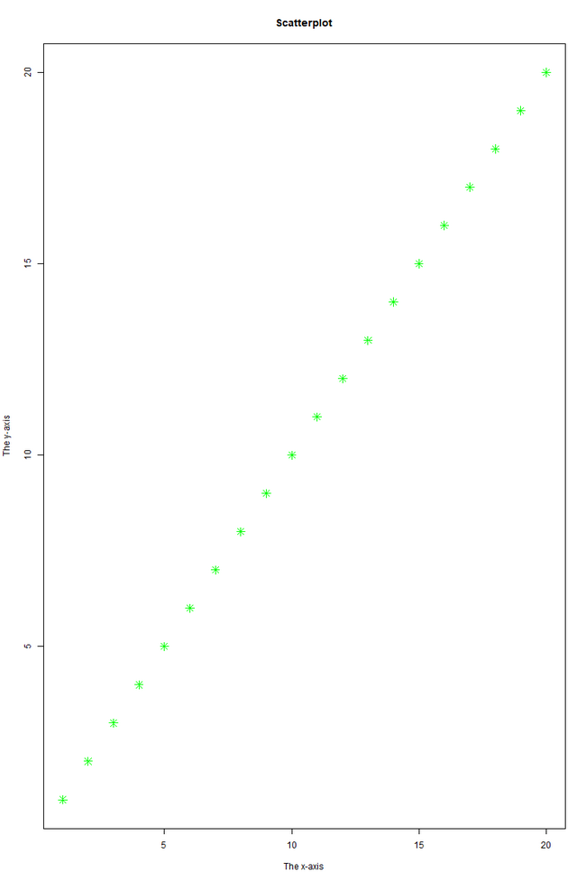 plot(1:20, type = "p", col = "green", pch = 8, cex = 1.5, main = "Scatterplot", xlab = "The x-axis", ylab = "The y-axis")RDen resulterande grafen ser ut som följer: