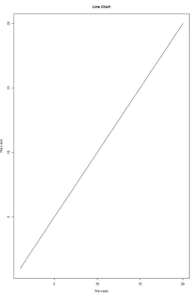 plot(1:20, type="l", main="Line Chart", xlab="The x-axis", ylab="The y axis")RResultatet ser ut som följer: