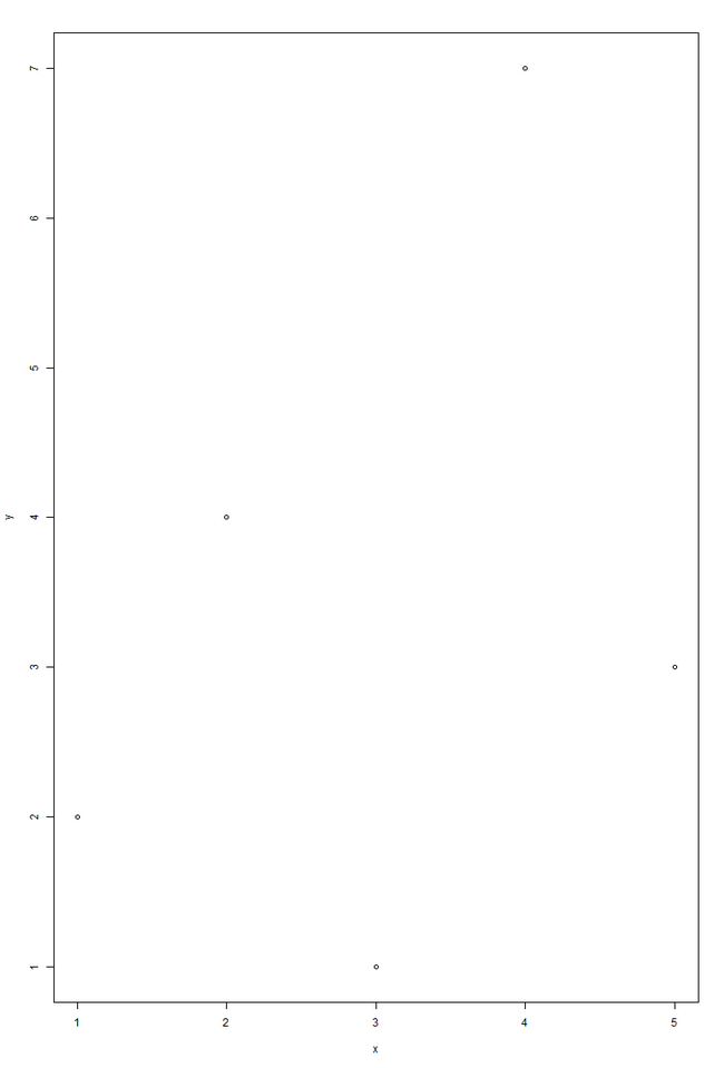plot(x, y, ...)RI följande exempel plottar vi värdena från vektorerna x och y på ett punktdiagram. Funktionen plot() använder standardvärden för diagramtyp, färger och axeletiketter eftersom dessa argument har lämnats tomma.